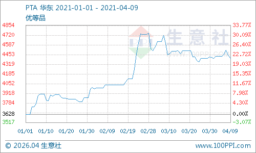 根据生意社价格监测显示,截至4月9日国内PTA现货市场价格在4398元/吨。4月以来PTA价格表现相对偏强,当前在成本支撑的背景下,工厂集中检修,市场去库节奏加快,叠加下游装置开工率高企,看多氛围浓厚。但终端订单受限以及PTA新装置投产预期下,市场博弈加剧,谨慎情绪加重,近两天出现小幅回落。