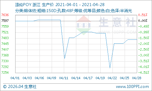 根据生意社价格监测显示,4月28日国内涤纶长丝市场行情暂稳,其中江浙一带主流工厂涤纶POY(150D/48F)报价在7350—7600元/吨,涤纶DTY(150D/48F低弹)报价在8800—9200元/吨,涤纶FDY(150D/96F)报价在7450—7800元/吨。