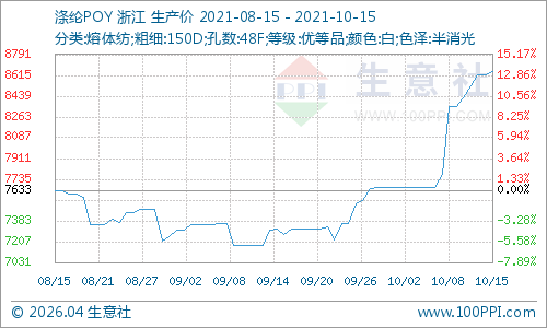 涤纶长丝行业受限电、限产影响去库存明显,利润情况得到修复,当前开工负荷在79%左右。价格方面维持小幅上行,根据生意社价格监测显示,截止10月15日江浙一带主流工厂,涤纶POY(150D/48F)报价在8450—7800元/吨,涤纶DTY(150D/48F低弹)报价在10250—10600元/吨,涤纶FDY(150D/96F)报价在8800—9050元/吨,10月11-15日期间各产品涨幅在2%左右。