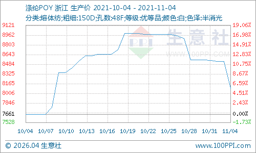 根据生意社价格监测显示,今日(11月4日)江浙一带主流工厂报价下调300-500元/吨,涤纶POY(150D/48F)报价在7850—8200元/吨,涤纶DTY(150D/48F低弹)报价在9900—10310 元/吨,涤纶FDY(150D/96F)报价在8300—8400元/吨。库存方面,聚酯市场整体库存集中在16-26天,其中POY库存至12-19天,FDY库存至15-17天附近,而DTY库存则至17-25天左右。
