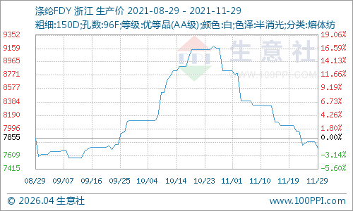 11月29日,根据生意社价格监测显示,江浙地区主流涤纶长丝工厂促销,个别规格下调100-200元/吨。其中涤纶POY(150D/48F)报价在7200—7650元/吨,涤纶DTY(150D/48F低弹)报价在8900—9300元/吨,涤纶FDY(150D/96F)报价在7400—7850元/吨。