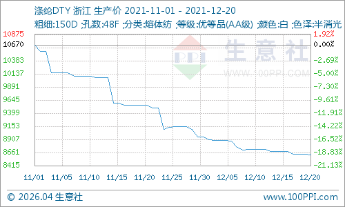 受成本利好提振影响,进入12月国内涤纶长丝市场行情跌势有所放缓,根据生意社价格监测显示,当前江浙地区主流涤纶长丝工厂涤纶POY(150D/48F)报价在7050—7300元/吨,涤纶DTY(150D/48F低弹)报价在8400—8800元/吨,涤纶FDY(150D/96F)报价在7300—7600元/吨。