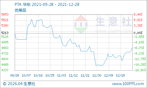 根据生意社价格监测显示,今日(12月28日)国内PTA市场行情维持小幅反弹,华东地区市场均价4881元/吨,较上一日上涨1.77%,同比上涨34.67%。PTA期货主力2205收盘4944结算4910,上涨86,涨幅1.77%。