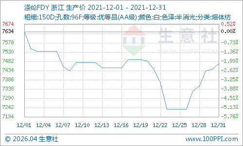 本周(12月26-31日)涤纶长丝在国际原油及PTA成本端同步利好下,价格呈现小幅反弹走势。根据生意社价格监测显示,截止12月31日江浙一带主流工厂涤纶POY(150D/48F)报价在7100—7450元/吨,涤纶DTY(150D/48F低弹)报价在8500—8900元/吨,涤纶FDY(150D/96F)报价在7400—7650元/吨。