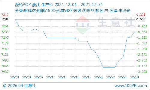 进入12月,受终端需求疲软,涤纶行情下跌为主,随着成本端提振,月末出现小幅反弹。根据生意社价格监测显示,截止12月31日江浙一带主流工厂涤纶POY(150D/48F)报价在7100—7450元/吨,涤纶DTY(150D/48F低弹)报价在8500—8900元/吨,涤纶FDY(150D/96F)报价在7400—7650元/吨。