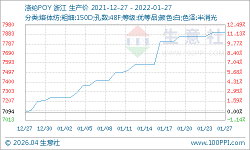 根据生意社价格监测显示,今日(1月27日)涤纶长丝市场总体暂稳,江浙地区工厂报价大多保持稳定,部分工厂个别规格小涨。主流涤纶长丝工厂涤纶POY(150D/48F)报价在7800-8150元/吨,涤纶DTY(150D/48F低弹)报价在9300-9500元/吨,涤纶FDY(150D/96F)报价在8000-8350元/吨。