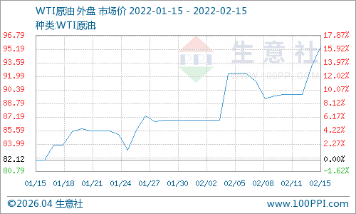 油价连续两个交易日大涨,创下逾七年新高,主因俄罗斯和乌克兰紧张关系升级;另外,OPEC+实际增产不达目标,加重了全球能源供应紧张的担忧。2月14日,国际原油期货价格大幅上涨。美国WTI原油期货主力合约结算价报95.46美元/桶,涨幅2.36美元或2.5%,布伦特原油期货主力合约结算价报96.48美元/桶,涨幅2.04美元或2.2%。
