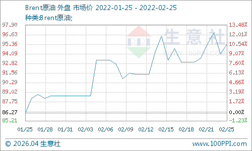 2月24日,国际原油期货价格大幅上涨。美国WTI原油期货主力合约结算价报96.77美元/桶,涨幅4.67美元或5.07%;布伦特原油期货主力合约结算价报95.42美元/桶,涨幅为1.37美元或1.45%。布伦特原油升破105美元,主因俄罗斯和乌克兰的地缘紧张局势加剧了市场对能源供应中断的担忧。