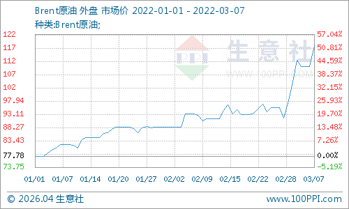 原油再度刷新2008年以来的高点,3月4日美国WTI原油期货主力合约结算价报115.68美元/桶,涨幅8.01美元或7.4%;布伦特原油期货主力合约结算价报118.11美元/桶,涨幅7.65美元或7.9%。西方制裁导致俄罗斯石油出口受阻,盖过了伊朗石油重返国际市场带来的供应利好。