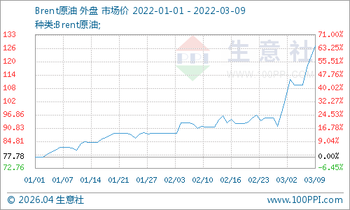 国际原油期货价格延续上行。3月8日,美国WTI原油期货主力合约结算价报123.70美元/桶,涨幅4.3美元或3.6%;布伦特原油期货主力合约结算价报127.98美元/桶,涨幅为4.77美元或3.9%。俄乌局势动荡,西方阵营对俄罗斯的制裁持续升级,美国提案禁止进口俄罗斯原油,英国也表示年底前逐步停止对俄原油进口,全球石油供应收紧预期持续升温。