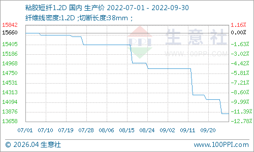 然而,粘胶短纤自今年7月份以来,一直呈现下跌走势,截止9月30日,1.2D*38mm粘胶短纤国内地区出厂报价为13840元/吨,较7月1日下跌11.62%,9月份下跌6.86%。需求端利好难觅,看空气氛浓厚,人棉纱交投难有起色,对原料采购热情一般,刚需补货为主。月下旬开始,原料溶解浆外盘价格下调,进一步促使粘胶短纤价格重心下一台阶。后市来看,成本支撑松动,需求疲软局面难以缓解,市场心态悲观,预计粘胶短纤产业链将延续弱势运行为主。
