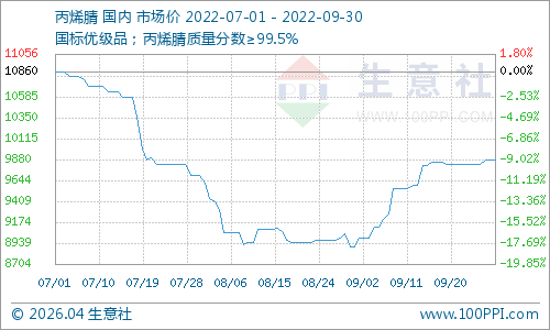 从上表可以看出,化纤市场除了粘胶产业链呈现弱势外,其余化纤产品均有不同程度的上涨,其中丙烯腈涨幅最为明显。截至9月30日丙烯腈市场散水价格在9870元/吨,较月初的8900元/吨上涨了10.90%。9月斯尔邦、吉林石化、上海赛科、浙江石化等丙烯腈装置继续保持降负运行。原料丙烯市场大幅走高,成本面支撑走强,截至9月29日国内丙烯价格在7620元/吨,较月初的7100元/吨上涨了7.32%。另外,需求增加,下游ABS开工继续维持8-9成高位运行、腈纶及丁腈橡胶行业开工保持稳定。自身减产、上下游利好叠加,但丙烯腈后期仍有新投产压力,预计后期丙烯腈行情将高位盘整。