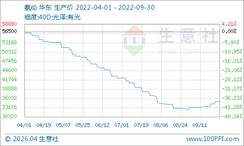 氨纶市场9月份呈现止跌上行,扭转连续5个月的下跌趋势。截止9月30日规格40D市场均价在35000元/吨,月涨幅7.03%。氨纶工厂装置负荷增加,行业开工提升至6.1成,市场货源供应充足。但原料价格走强明显,加之“金九”终端回暖,下游客户拿货积极,氨纶库存压力逐渐缓解,个别规格型号库存紧张。厂家报盘提涨,当前市场整体出现好转迹象,成本利好支撑不减,短期内氨纶价格仍将小幅攀升。
