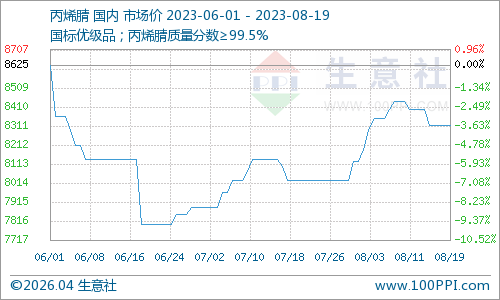 本周(8.11-8.19)丙烯腈市场行情延续小幅走低。据生意社商品行情分析系统显示,截至8月19日丙烯腈市场散水价格在8312元/吨,较上周五的8400元/吨下跌了1.04%。目前丙烯腈市场出罐自提价格在8200~8400元/吨之间。原料价格小幅走高,对丙烯腈仍有成本支撑;下游开工较前期小幅提升,对丙烯腈需求较前期小幅增加;丙烯腈装置开工提升,对丙烯腈有一定利空压制。