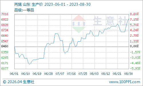 近期(8.21-8.30)原料丙烯市场行情小幅走高,丙烯腈成本面继续支撑。据生意社商品行情分析系统显示,截至8月30日国内丙烯价格在6938元/吨,较21日的6850元/吨上涨了1.28%。
