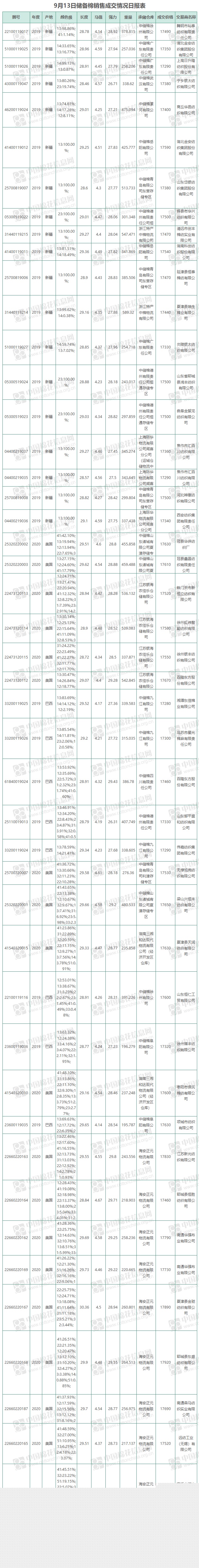 9月13日储备棉销售资源20001.0817吨,实际成交15978.6577吨,成交率79.89%。平均成交价格17505元/吨,较前一日上涨13元/吨,折3128价格17949元/吨,较前一日下跌67元/吨。