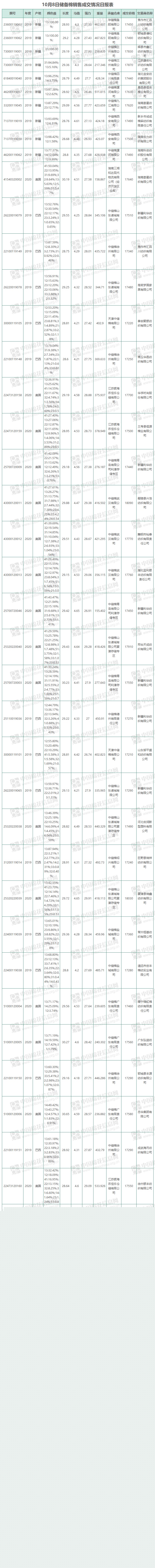 10月8日储备棉销售资源20000.6141吨,实际成交18295.7791吨,成交率91.48%。平均成交价格17479元/吨,较前一日下跌73元/吨,折3128价格17924元/吨,较前一日下跌56元/吨。