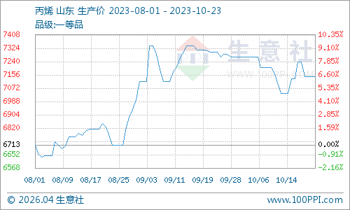 近期(10.12-10.23)原料丙烯市场行情震荡小幅反弹,丙烯腈成本面仍有支撑。据生意社商品行情分析系统显示,截至10月23日国内丙烯价格在7143元/吨,较12日的7105元/吨上涨0.53%,周期内低点在7038元/吨,高点在7238元/吨。