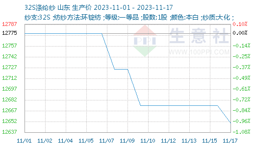 市场综述:据生意社商品行情分析系统显示,截止2023年11月17日,山东地区纯涤纱市场参考价格微跌,报12650元/吨,较上周价格(12675元/吨),下跌25元/吨,跌幅0.20%;涤棉纱市场参考价格微跌,报17420元/吨,较上周价格(17460元/吨),下跌40元/吨,跌幅0.23%。