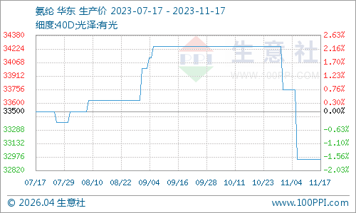 据生意社商品行情分析系统,本周(11月13-17日)国内氨纶市场行情暂稳,截止11月17日40D氨纶价格为32950元/吨,较周初持平,同比下跌11.72%。