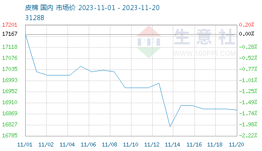 近期棉价维持弱势向下,15日储备棉停止销售后,棉价波动幅度变窄,据生意社商品行情分析系统,11月20日3128B级皮棉现货价格在16882元/吨,周跌幅0.59%,较月初下跌1.66%。