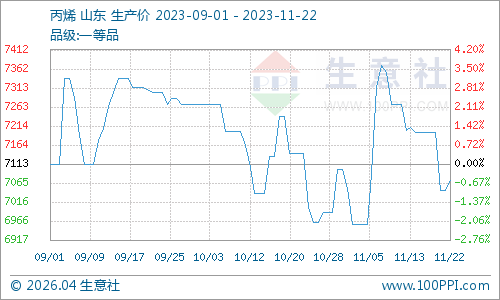 近日(11.13-11.22)原料丙烯市场行情震荡小幅走低,丙烯腈成本面支撑走弱。据生意社商品行情分析系统显示,截至11月22日国内丙烯价格在7058元/吨,较13日的7203元/吨下跌2.01%。