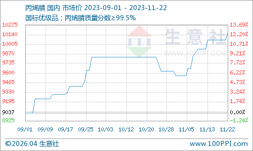近日(11.13-11.22)丙烯腈市场行情延续小幅上涨。据生意社商品行情分析系统显示,截至11月22日丙烯腈市场散水价格在10162元/吨,较13日的9937元/吨上涨了2.26%。目前丙烯腈市场出罐自提主流价格在10000~10300元/吨之间。原料价格震荡小幅走低,成本对丙烯腈支撑小幅走弱;主要下游ABS开工基本稳定;丙烯腈装置开工小幅走低,供需面基本无压力,丙烯腈市场刚需询盘支撑,价格走高。
