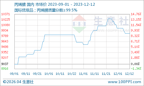 近日(12.1-12.12)丙烯腈市场行情小幅走低。据生意社商品行情分析系统显示,截至12月12日丙烯腈市场散水价格在9862元/吨,较月初的10000元/吨下跌了1.38%。目前丙烯腈市场出罐自提主流价格在9700~9900元/吨之间。原料价格震荡小幅走低,成本对丙烯腈支撑小幅走弱;主要下游ABS开工小幅波动;丙烯腈装置开工提升,供需面较前期增加,丙烯腈市场刚需询盘支撑,价格高位震荡整理。