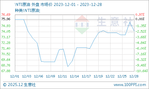 原油市场本月上旬由于美元汇率走强和对需求担忧抵消了对供应担忧,欧美原油期货连续四个交易日下跌并且一度下跌至五个月来最低。但是受地缘局势影响,国际油价一度上涨至两周以来高点,截止12月27日,美国WTI原油期货主力合约结算价报74.11美元/桶,布伦特原油期货主力合约结算价报79.54美元/桶。