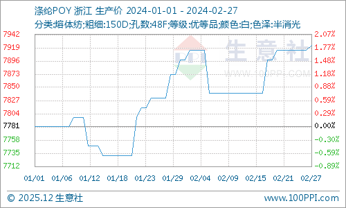 2月27日,国内涤纶长丝市场价格偏暖调整,江浙主流涤纶长丝工厂POY(150D/48F)报价在7700-8000元/吨,涤纶DTY(150D/48F低弹)报价在9050-9300元/吨,涤纶FDY(150D/96F)报价在8450-8700元/吨。涤丝工厂装置陆续恢复重启,普遍对后期信心较高。