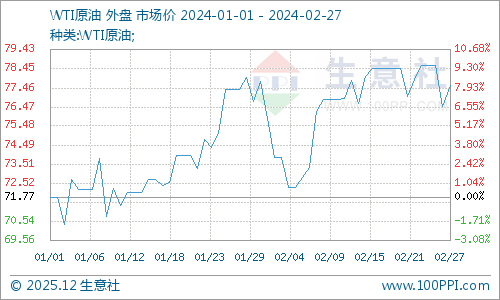 目前原油市场处于多空消息交织,价格高位波动,截止2月26日,美国WTI原油期货主力合约结算价报77.58美元/桶,布伦特原油期货主力合约结算价报81.67美元/桶。受中东地缘关系紧张、美国经济衰退担忧及美联储利率等多重因素影响而大概率延续震荡调整。