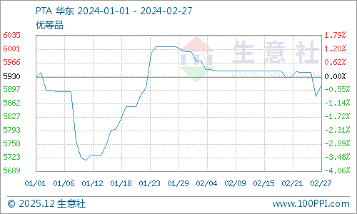 PTA短期暂无计划内大型装置检修、重启,装置偏稳运行,货源供应充足,价格方面窄幅波动,截止2月27日华东地区市场价格5911元/吨。