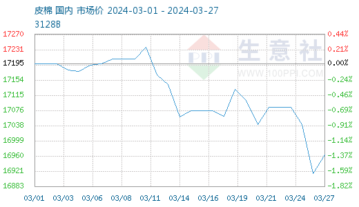 3月以来传统旺季表现不佳,皮棉销售进度缓慢,棉花行情震荡下跌。据生意社商品行情分析系统,3月27日3128B级皮棉现货价格在16962元/吨,较月初下跌1.35%。