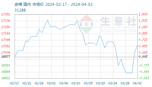 上周棉价在触及年后新低后,受外围利好刺激,国内现期货行情均小幅上涨。据生意社商品行情分析系统,4月2日3128B级皮棉现货价格在17066元/吨,较2月中旬上涨0.53%。