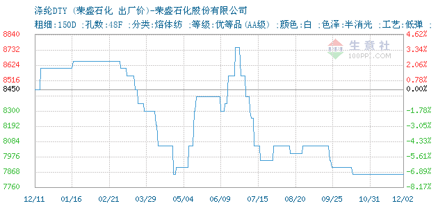 04月11日荣盛石化关于 涤纶DTY的报价为9100元/吨。 涤纶DTY的规格:粗细:150D ;孔数:48F ;分类:熔体纺 ;等级:优等品(AA级) ;颜色:白 ;色泽:半消光 ;工艺:低弹 ;。该报价有效期为3天。报价提供方:荣盛石化股份有限公司。